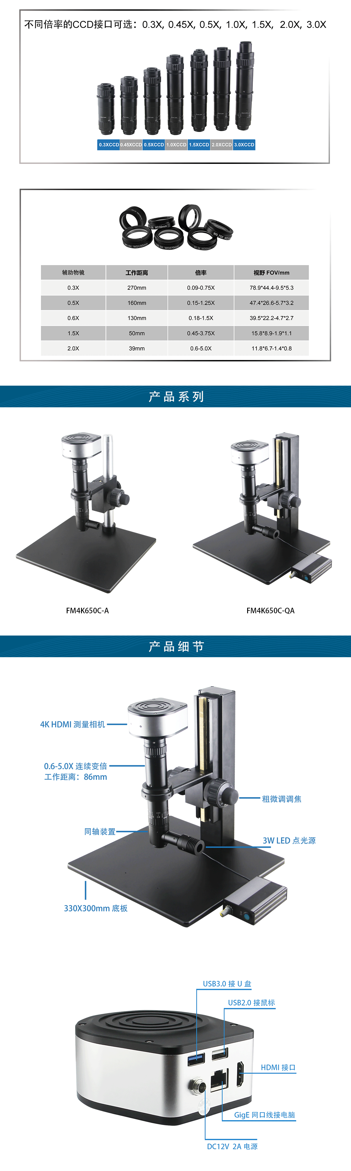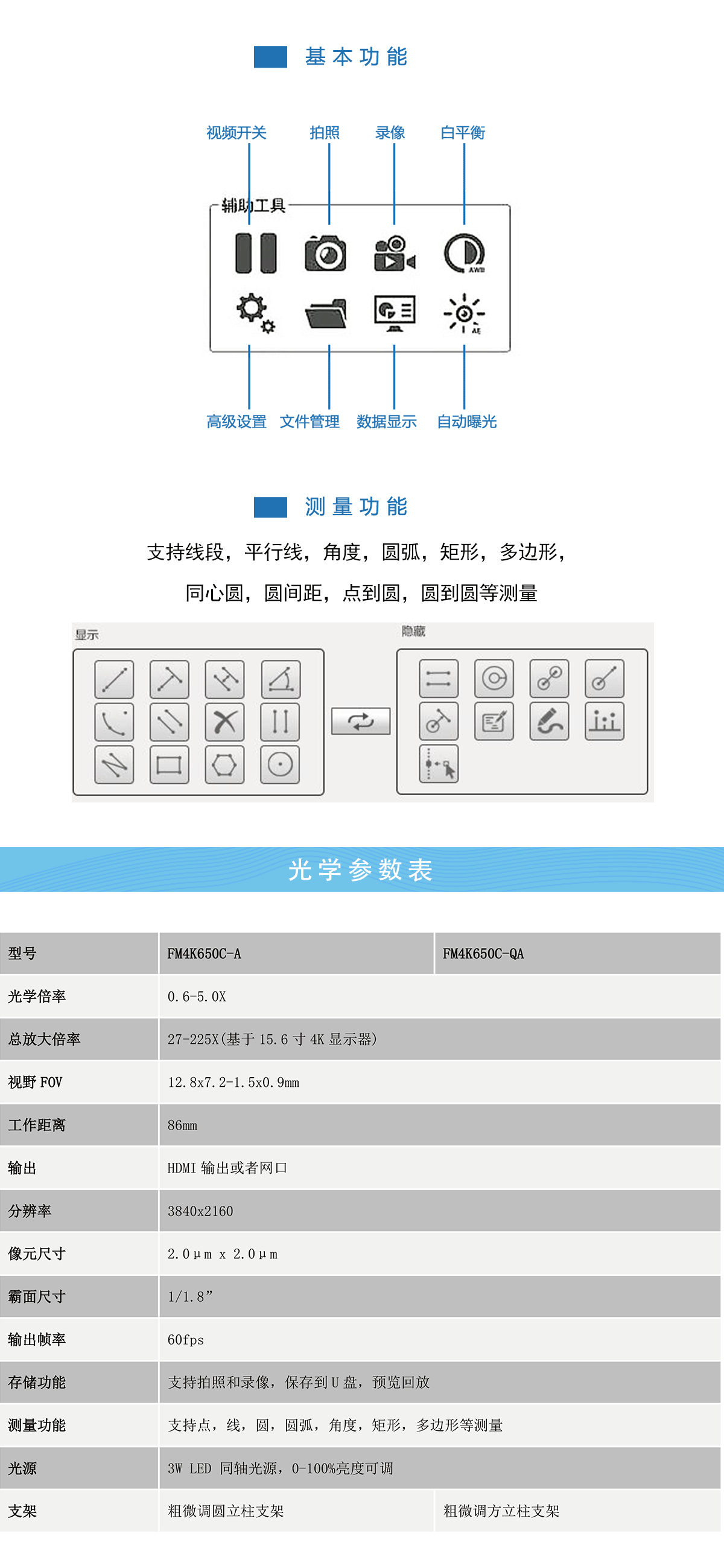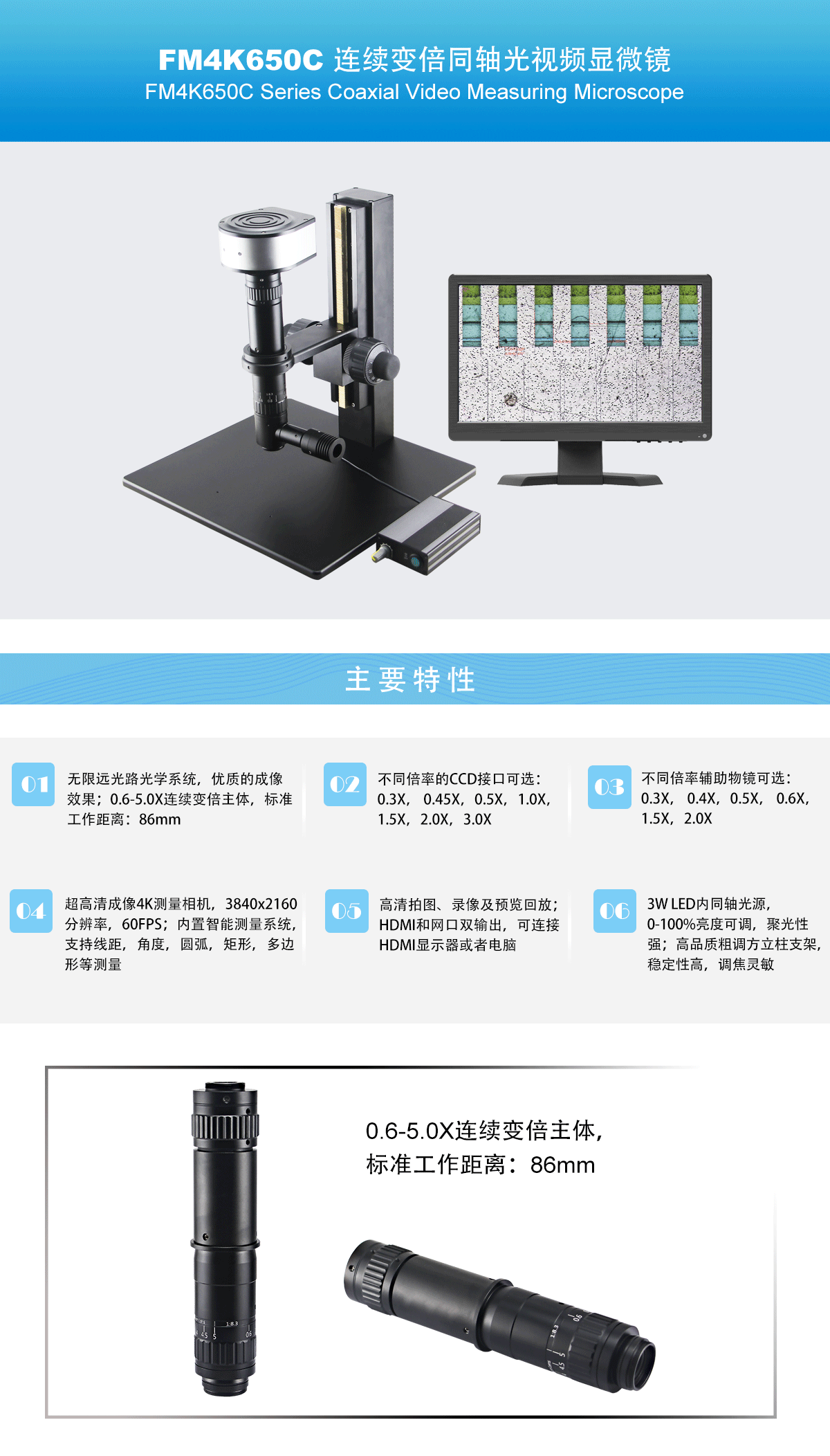 无限远光路光学系统,优质的成像效果;0.6-5.0X连续变倍主体,标准工作距离:86mm;超高清成像4K测量相机,3840x2160 分辨率,60FPS;内置测量系统,高清拍图、录像及预览回放;HDMI和网口双输出。