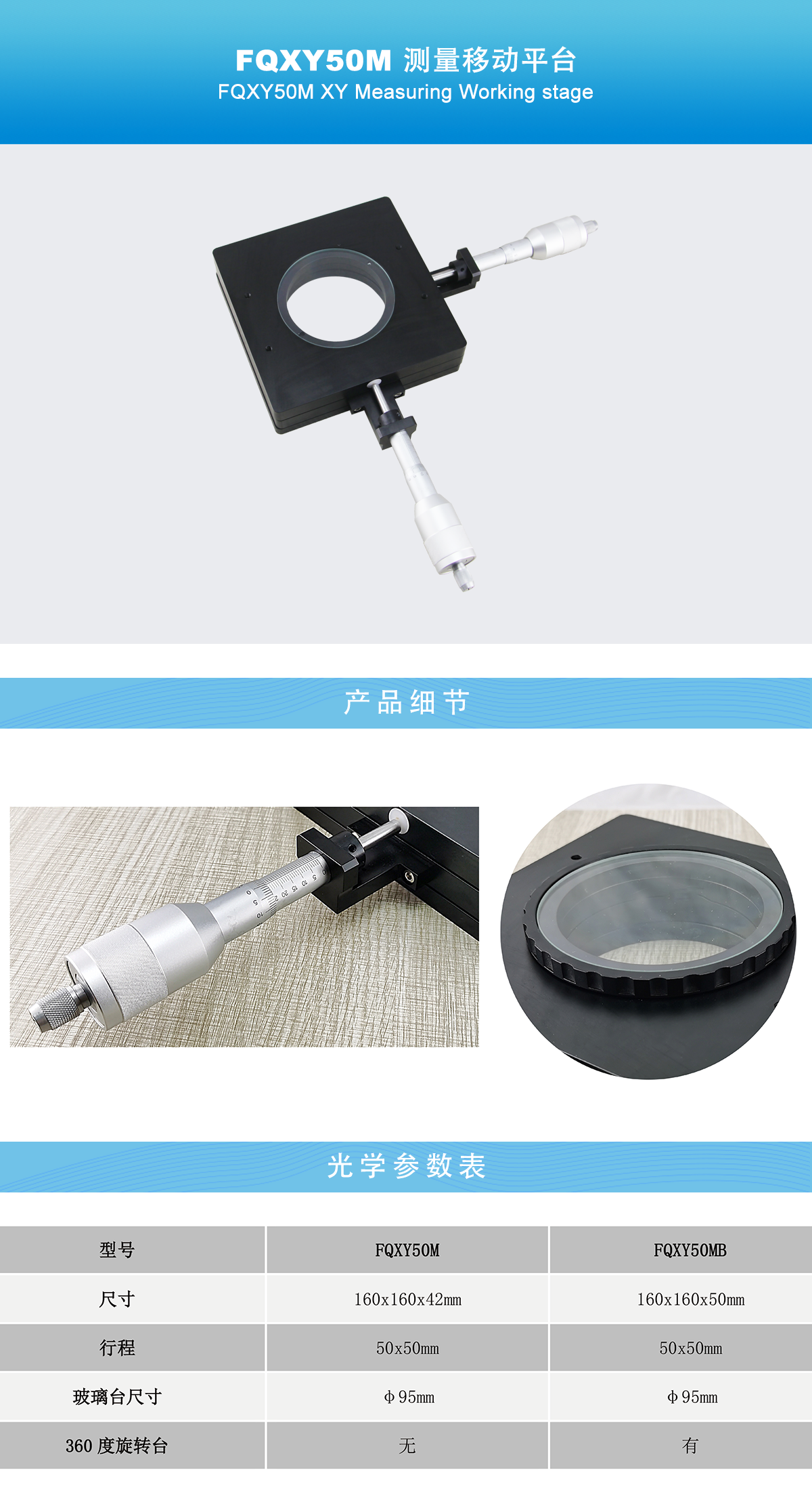 • 尺寸160x160x42mm,行程50x50mm,玻璃台尺寸φ95mm,360度旋转台可选