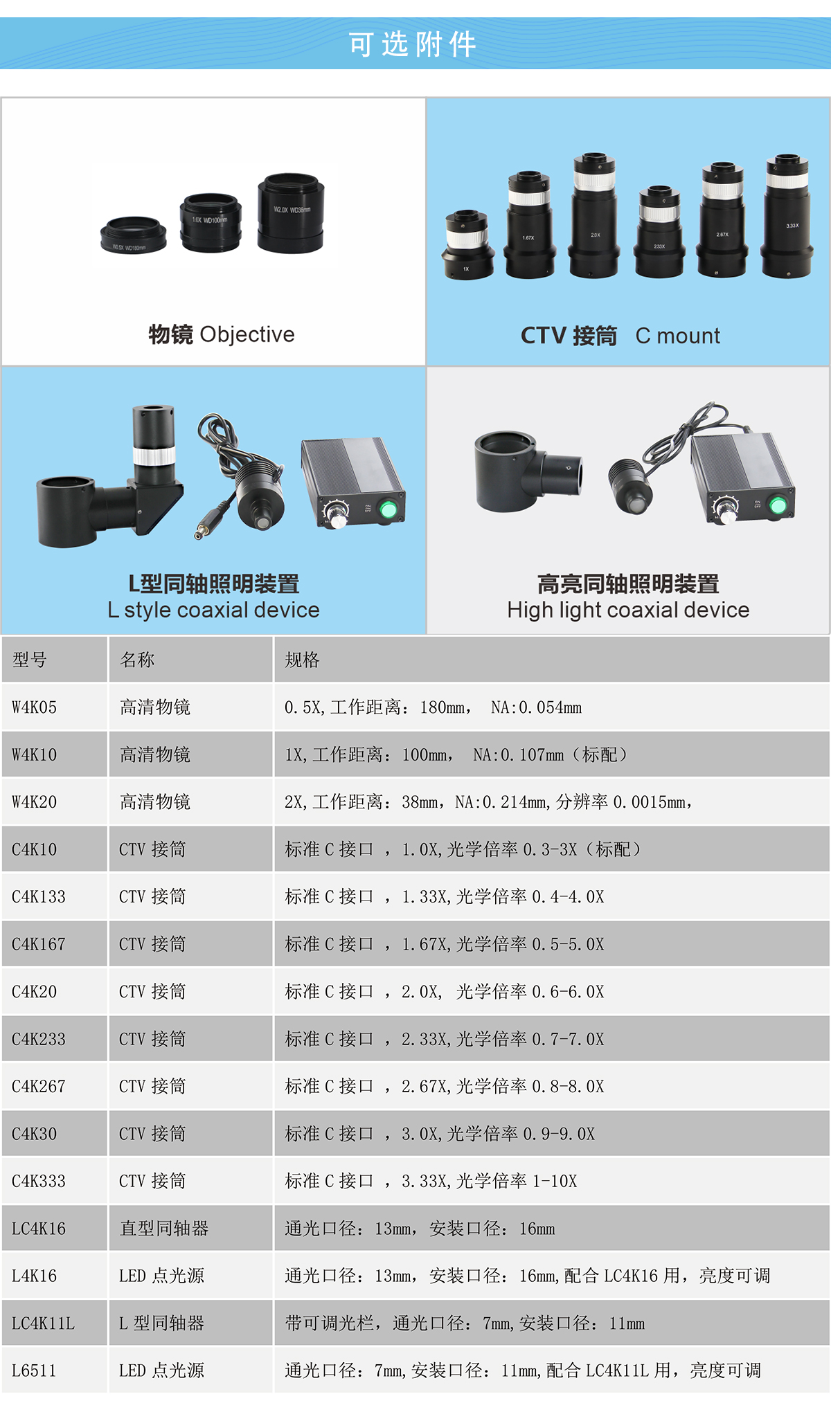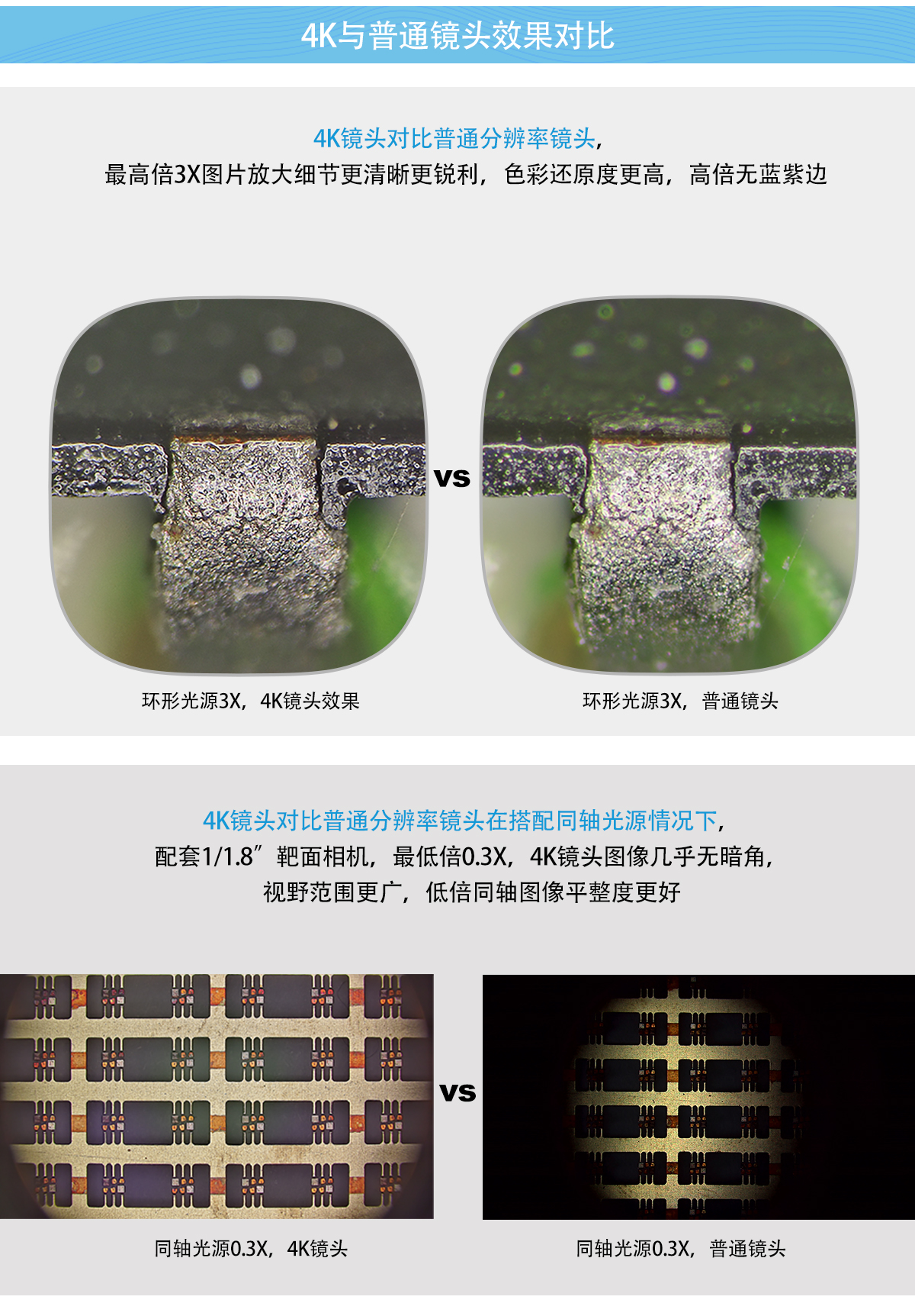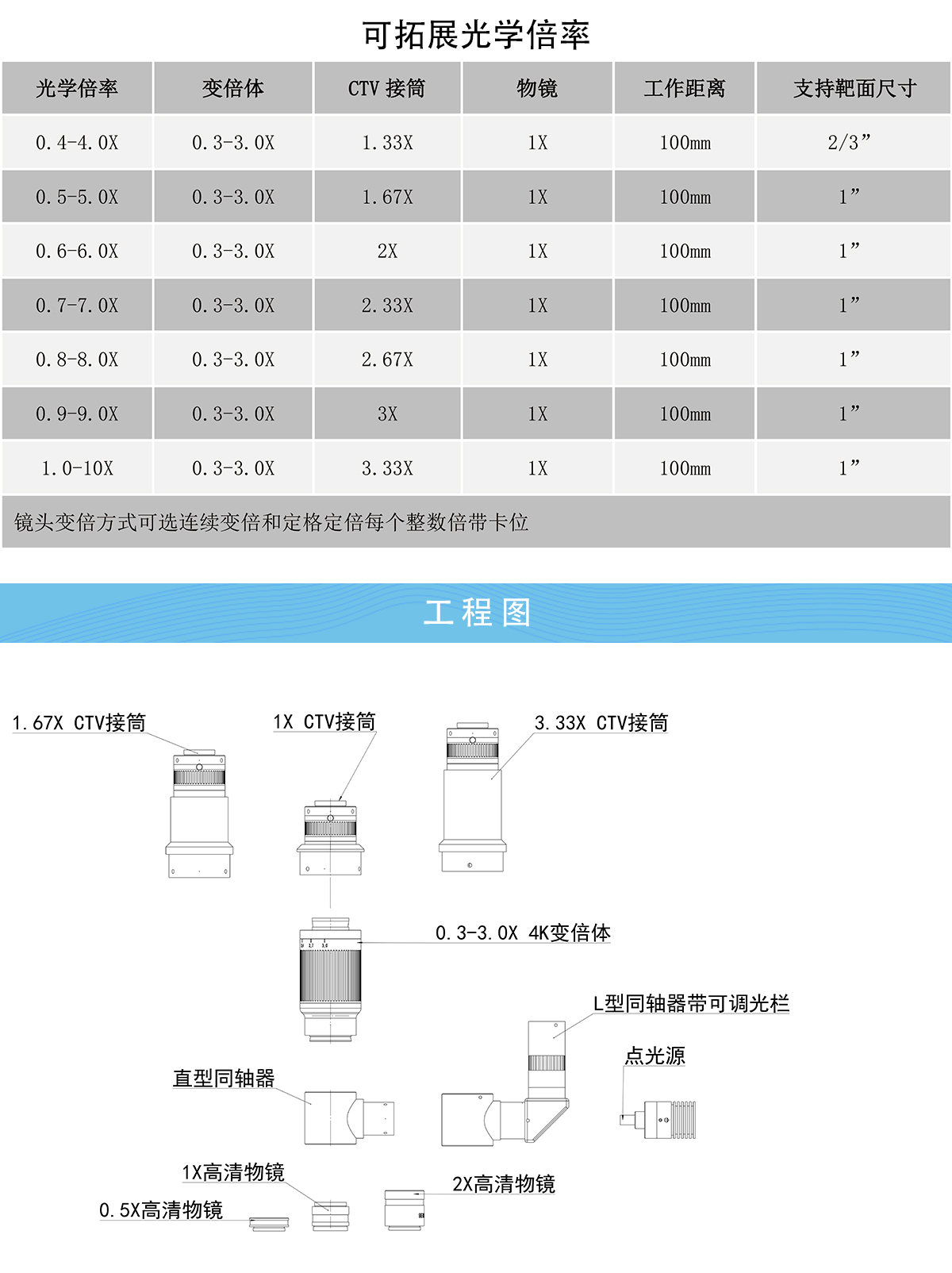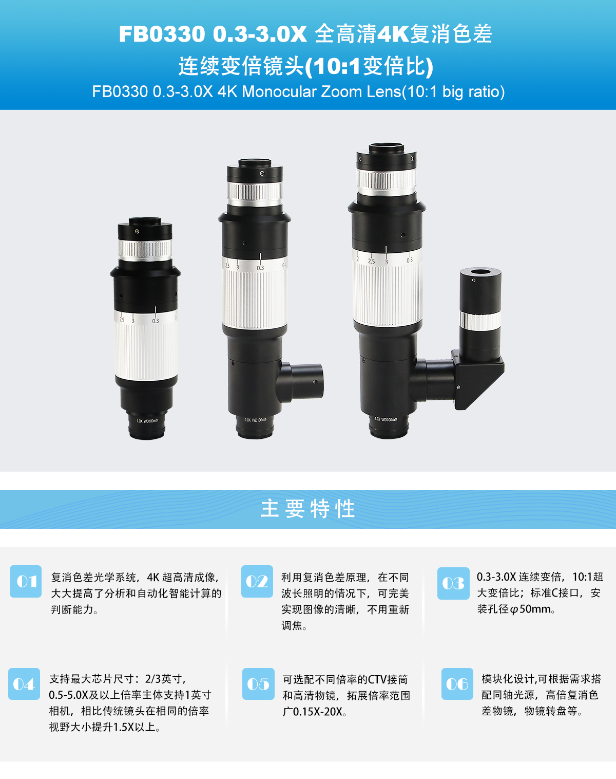 复消色差光学系统,4K 超高清成像,0.3-3.0X 连续变倍,工作距离100mm,支持最大靶面尺寸2/3”,0.5-5.0X光学倍率以上可支持最大靶面尺寸1”,模块化设计,可选配不同倍率的摄影目镜和物镜,10:1 超大变倍比,拓展倍率0.15X-20X。