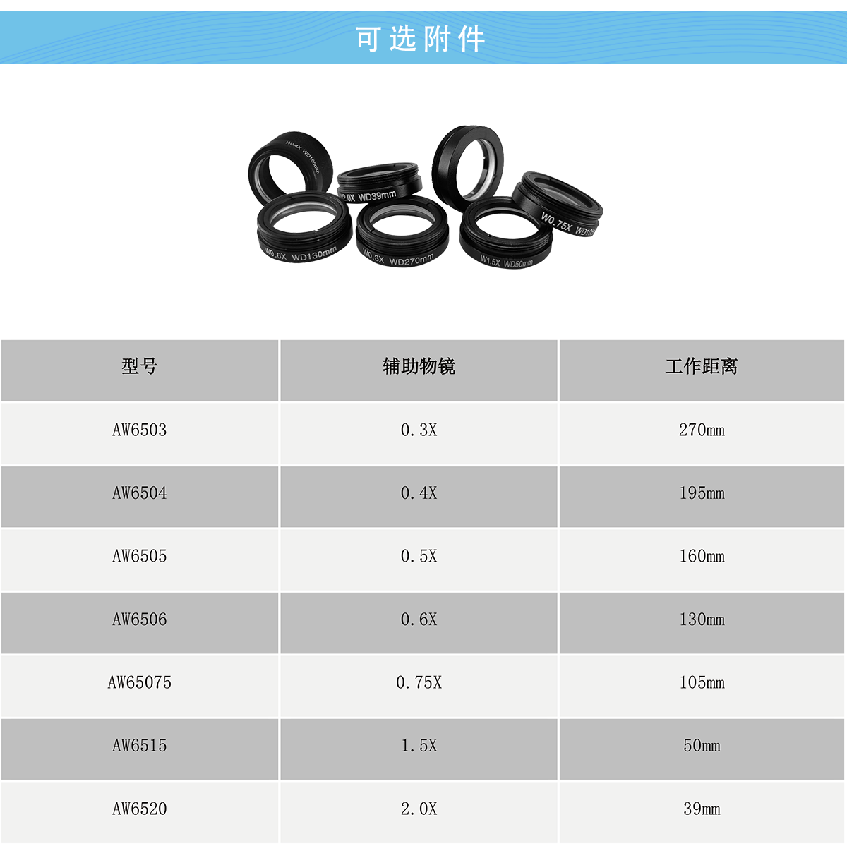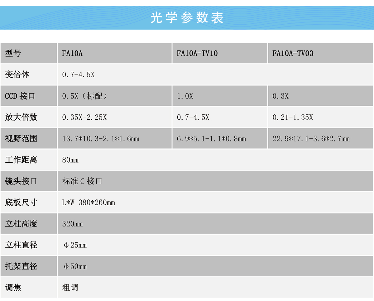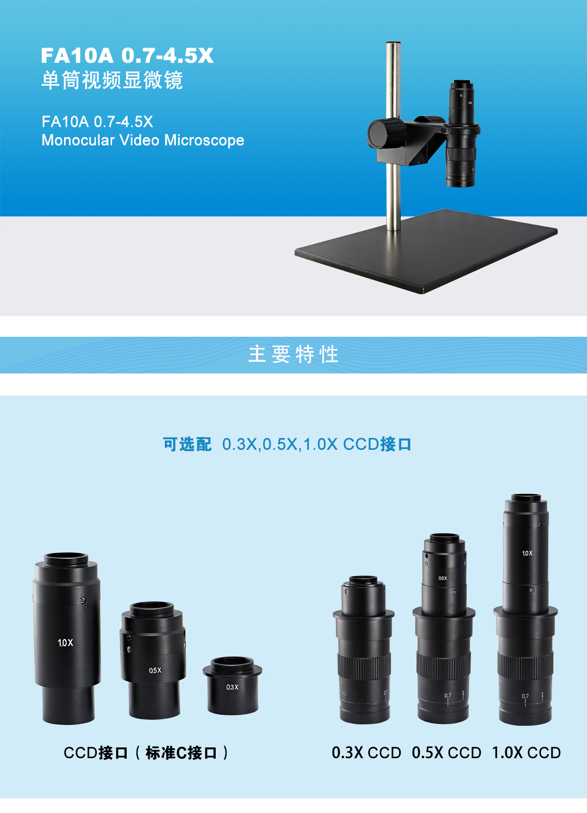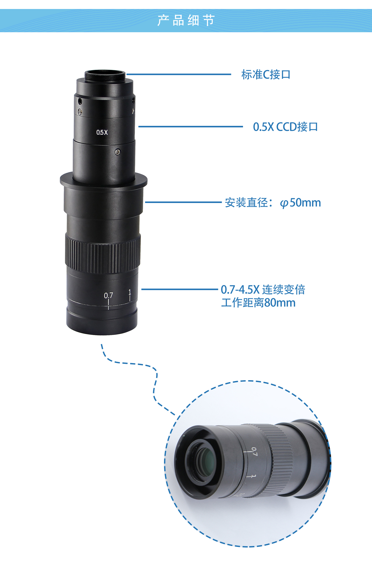 • 0.7-4.5X 连续变倍,标准C接口,80mm 工作距离,0.3X,0.5X,1X CTV 接筒可选